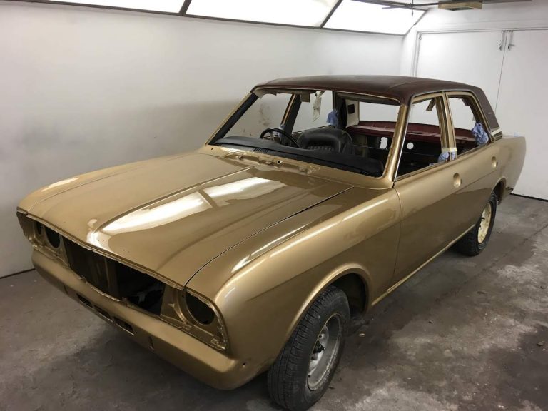 Last week we finished painting this Mk2 Cortina in it’s original Amber Gold. We had some difficulty getting this colour right. We had to find an untouched are of the original body work to colour match to. The end result…